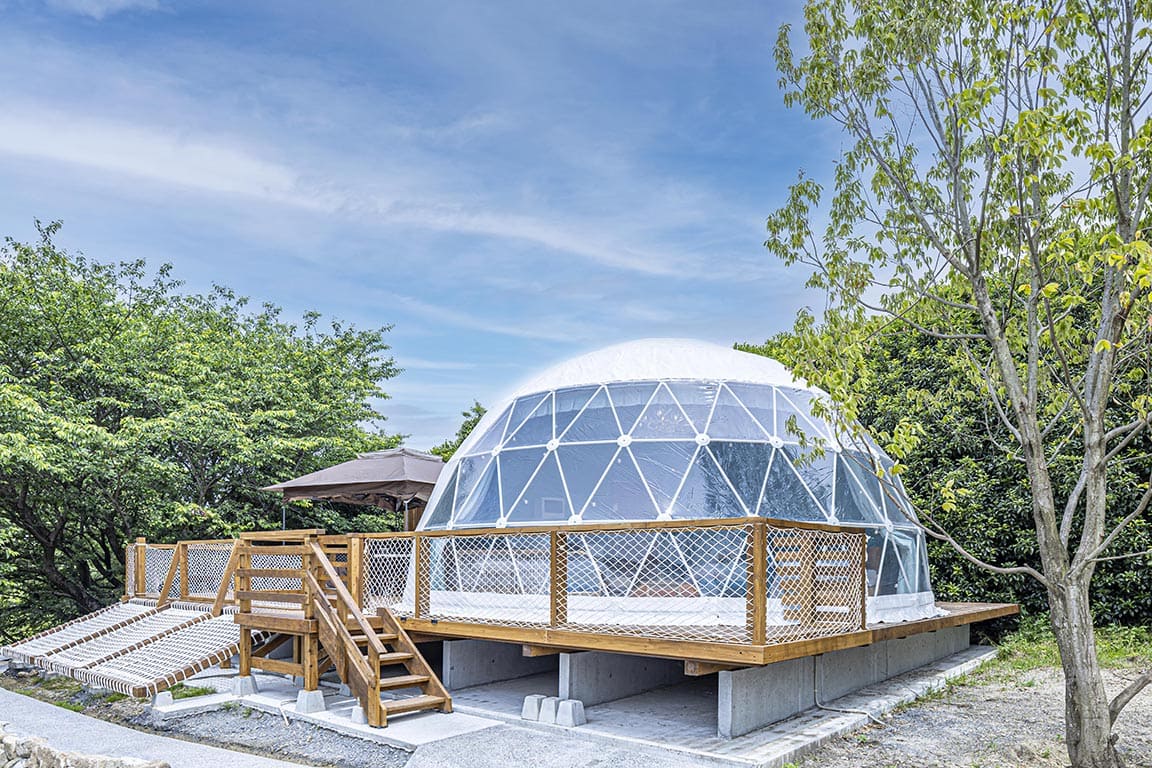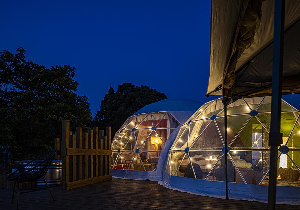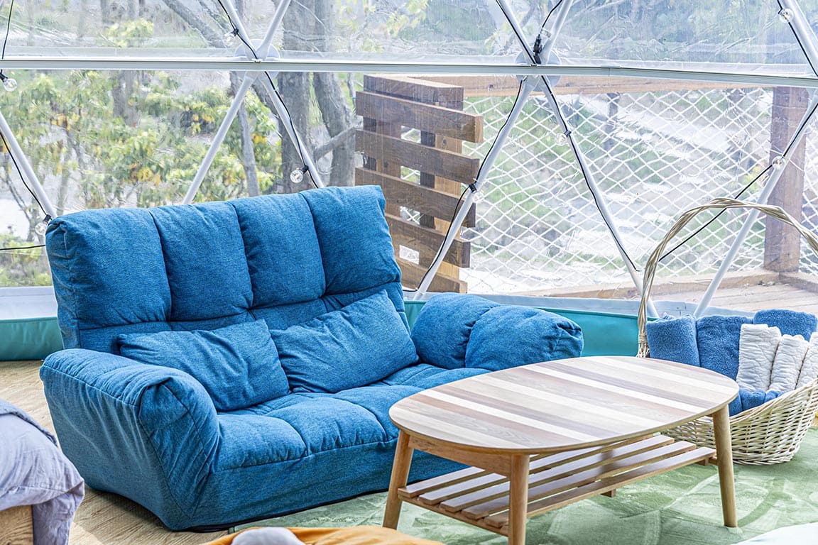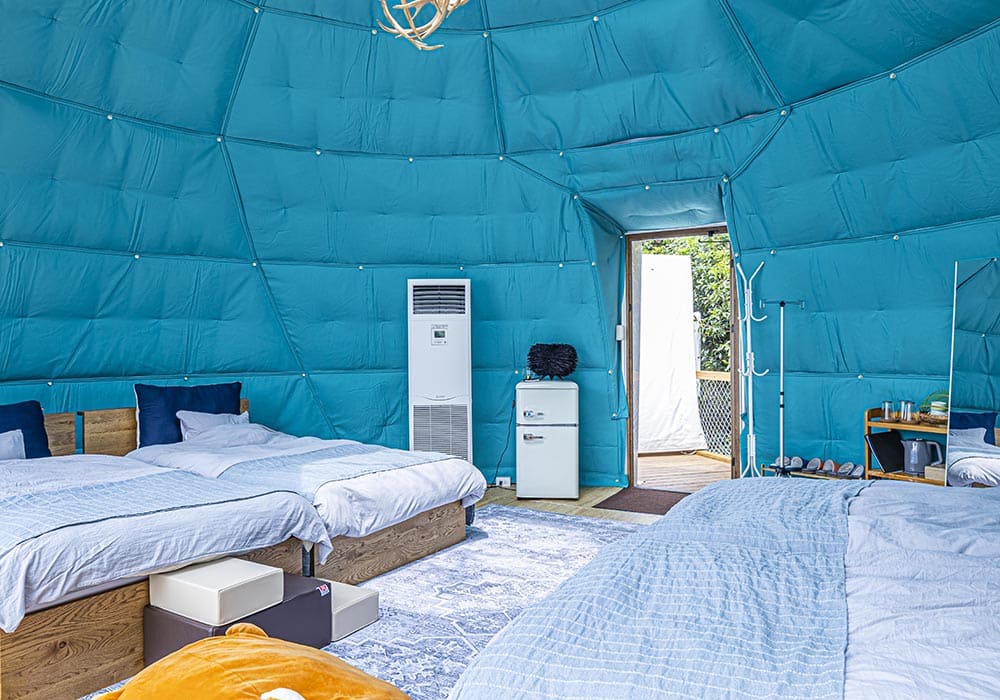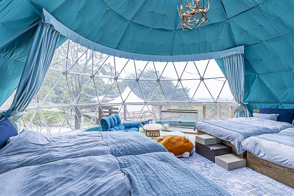 With a maximum capacity of 8 guests, the Connect Dome is perfect for student trips, multi-generational families, or group stays. This spacious 48㎡ tent connects two domes and is the first of its kind in Ukiha City.